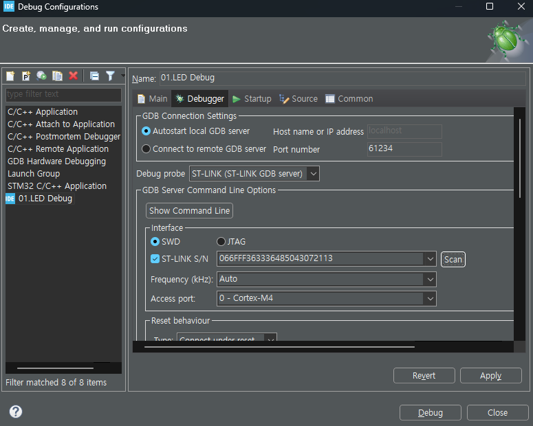 Debugger에서 아래 ST-LINK S/N를 체크한 후 스캔 버튼을 누른다