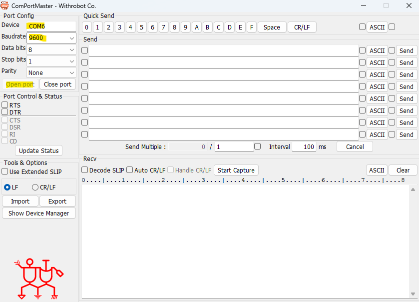 컴포트 마스터를 실행하고 디바이스에 포트 넘버, 보율에 아까 입력했던 9600을 입려하고 open port를 누른다
