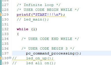 다시 main.c로 돌아와서 pc_command_processing() 함수를 extern 해주고 위와 같이 while문 안에서 함수를 실행한다