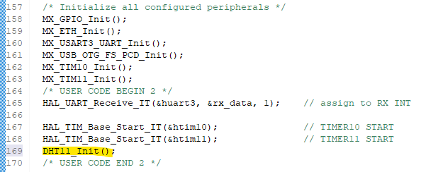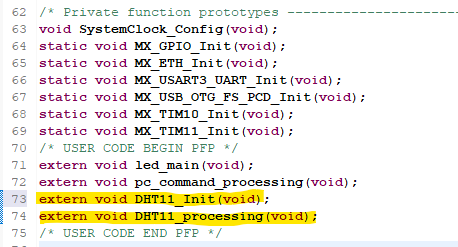main.c에 init과 processing 함수를 extern 해주고 main() 안에서 DHT11_Init()을 호출한다
