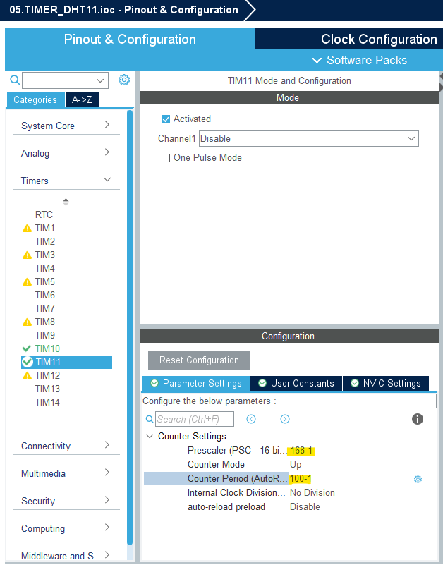tim11 역시 APB2 버스를 사용하고 해당 버스는 168MHz이기 때문에 분주기를 168로 설정하고 Count Period를 100으로 설정하면 1us의 타이머가 생성된다