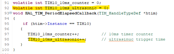 main.c의 기존 TIM10 타이머에 초음파 측정기를 위한 변수를 추가해주고
