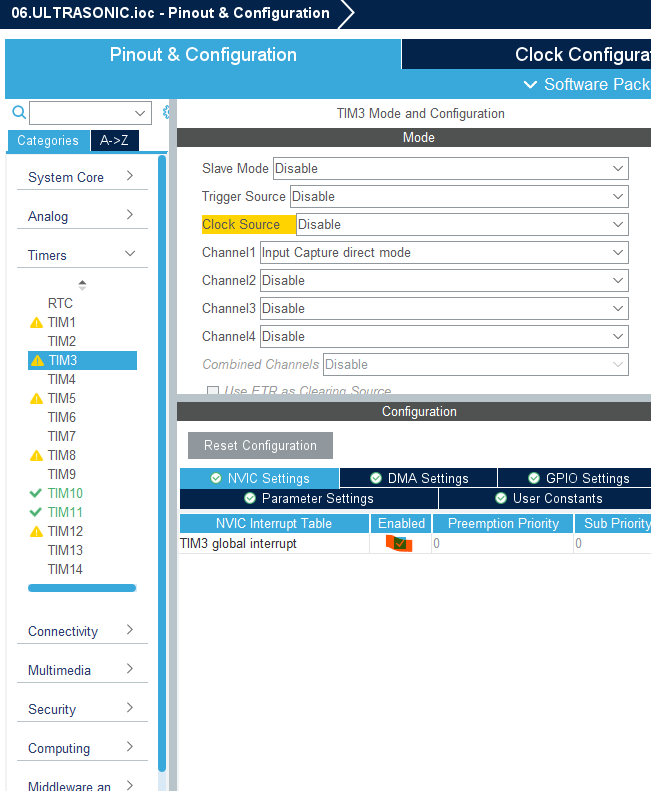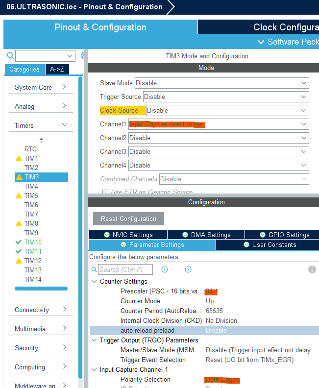 먼저 가운데 Trigger와 Echo를 연결할 핀과 타이머를 활성화해주자