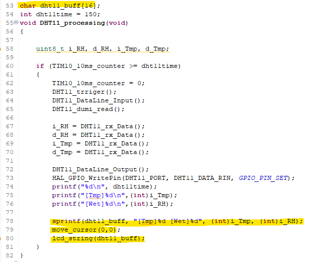 그러면 lcd_buff에 온 습도 정보를 담고 첫 번째 줄에 버퍼의 내용을 출력한다