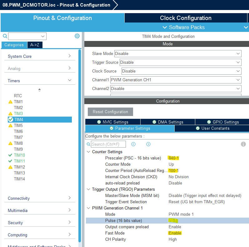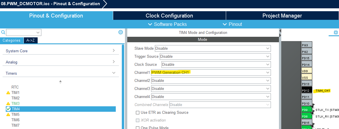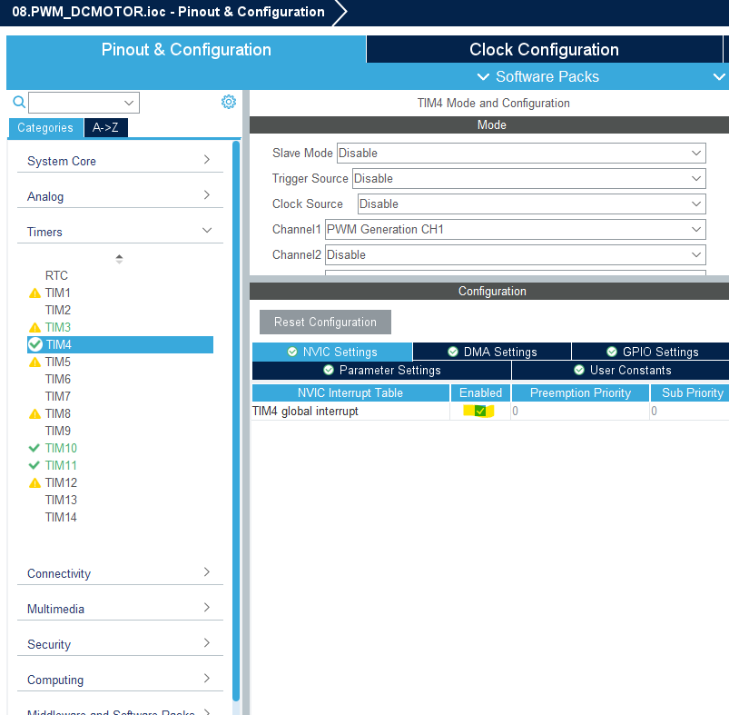 PWM 제어를 사용하기 위해 ioc에서 TIM4의 Channel1 PWM Generation CH1로 활성화하자
