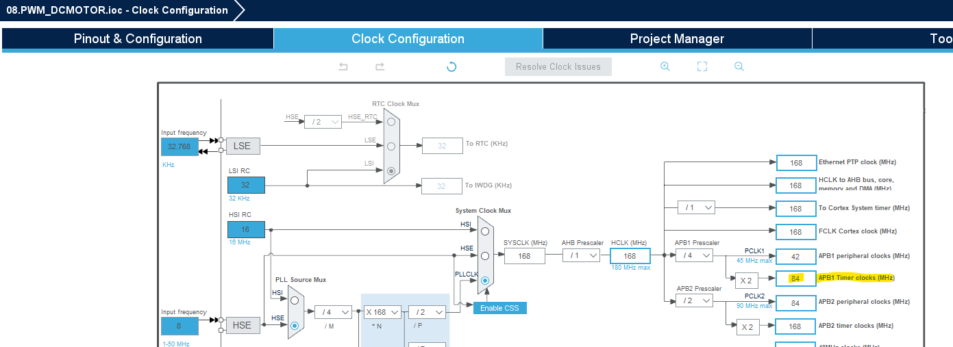Clock Configuration을 확인하면 APB1은 84MHz의 주파수를 가진 것을 확인할 수 있다