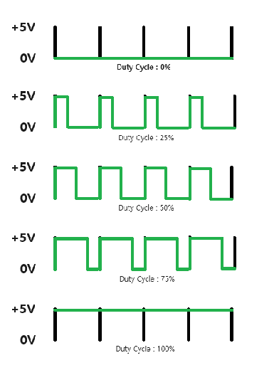 PWM (Pulse Width Modulation)은 펄스 폭 변조라고해서 0과 1을 반복하는 디지털 신호에서 한번 0에서 1로 갈때 그 0과 1의 비율을 조절하는 것이다