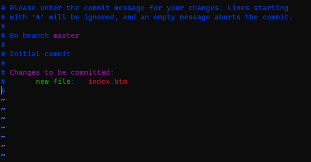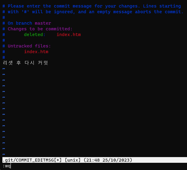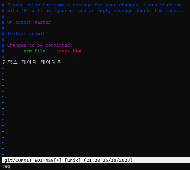 i를 입력하면 수정이 가능해지는데, 내부에 커밋 메시지를 입력하고 ESC를 누른후 :wq를 입력하고 엔터를 누르자