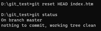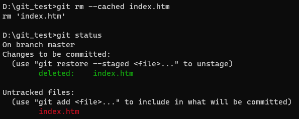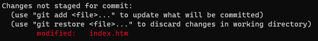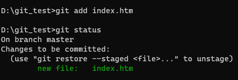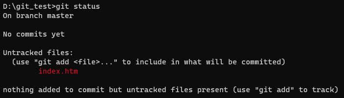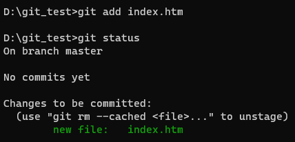 status로 상태를 확인해주면 index.htm 파일의 상태가 Tracked가 돼서 스테이지 영역에 등록됐다는 것을 알 수 있다