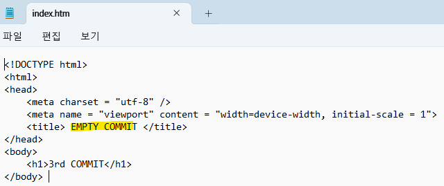 먼저 깃 저장소 폴더에서 간단한 HTML 파일을 하나 작성하자