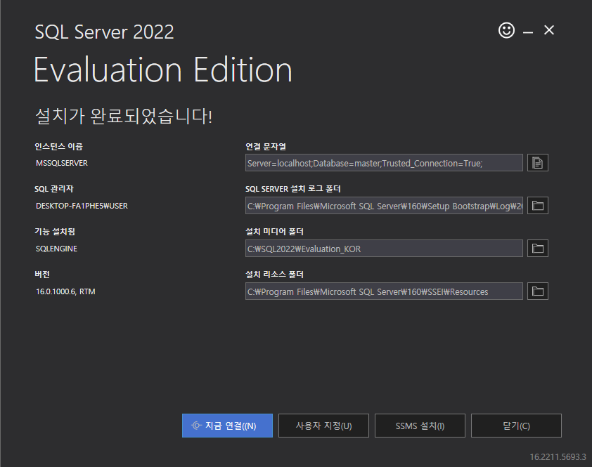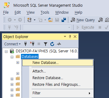 SSMS 설치가 완료되면 들어가서 데이터베이스를 생성하자