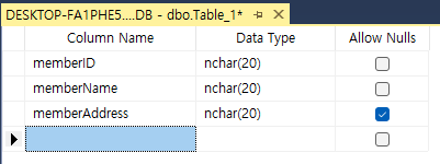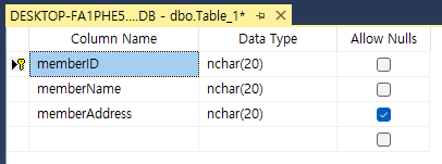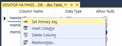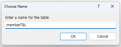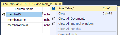테이블을 구성했으면, 노란 부분에서 마우스 오른쪽을 클릭해 생성한 테이블을 저장하자