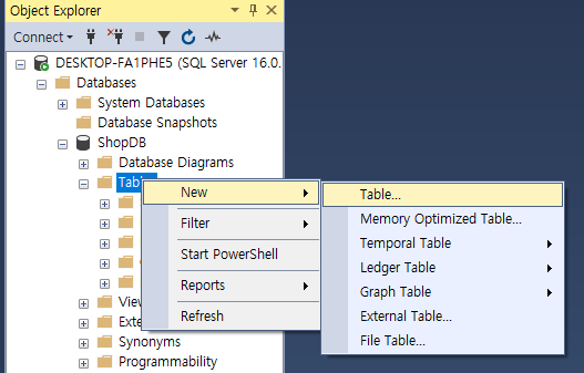 위 그림처럼 테이블 폴더에서 새 테이블을 생성해주자
