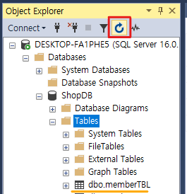 테이블을 생성하면 바로 적용이 안되는데, 빨간 부분의 새로고침 버튼을 눌러주면