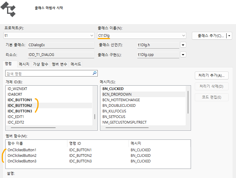클래스 마법사에서 버튼 클릭 함수를 추가한다