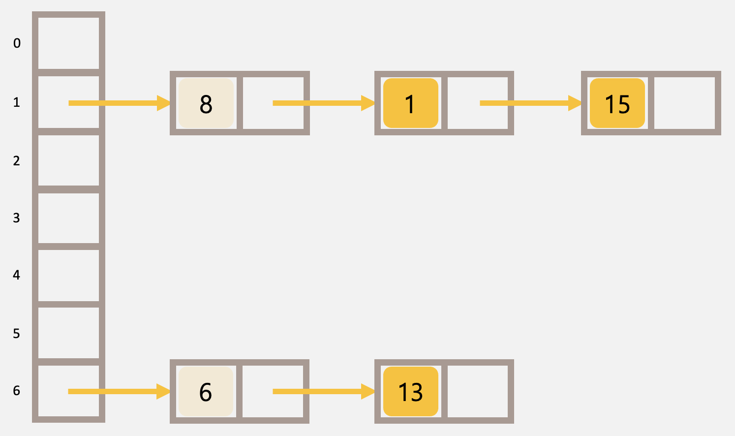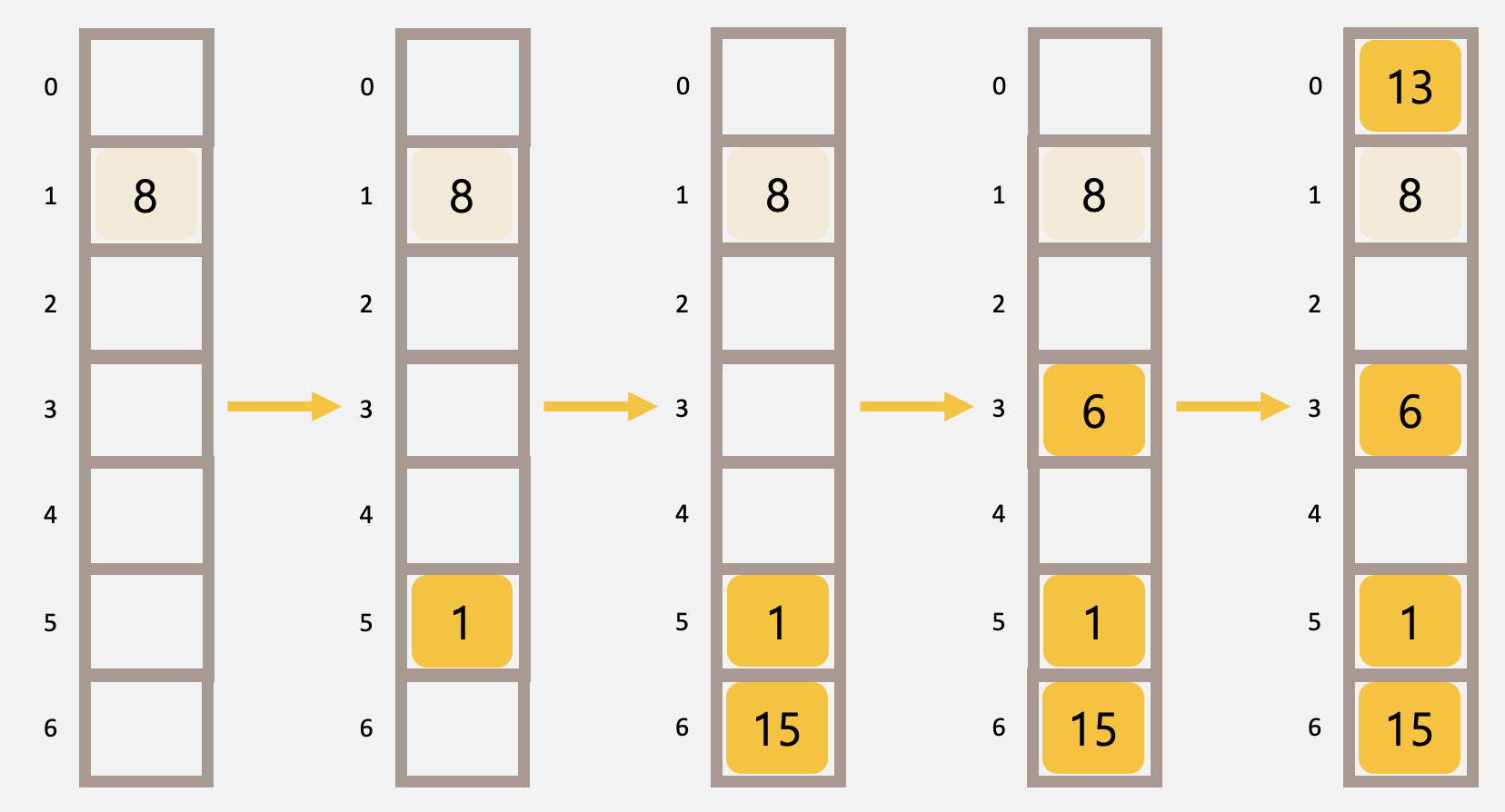 8, 1, 15, 6, 13 순서대로 삽입 / 테이블 크기 7