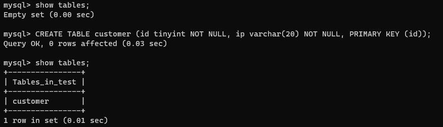 처음엔 당연히 비어있고, 이후 테이블 생성 후 조회하니 테이블이 생성된 것을 확인할 수 있다