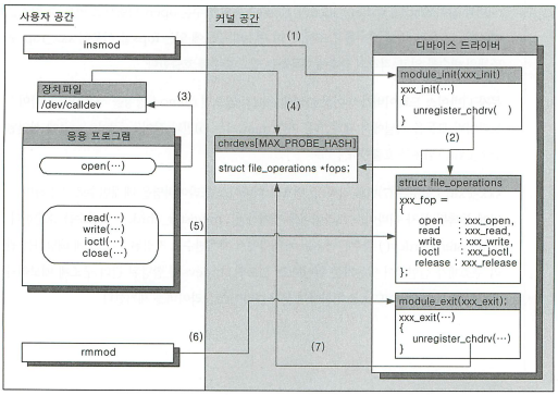 위 사진은 문자 디바이스 드라이버가 커널에 등록되고 응용 프로그램에서 디바이스 파일을 통해 디바이스 드라이버를 제어한 뒤 다시 커널에서 제거되는 과정을 도식화 한 것이다