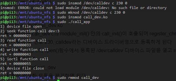 를 실행하면 call_dev.c의 module_init() 안의 call_init()이 호출되며 register_chrdev() 함수를 통해 문자 디바이스 드라이버를 커널에 주 번호 230, calldev라는 디바이스 드라이버명으로 등록하게 된다